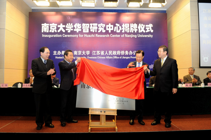 11月21日,南京大学华智研究中心揭牌成立(以下简称“中心”)。江苏省副省长陈震宁、南京大学校长陈骏以及全国政协经济委员会副主任、世茂集团董事局主席许荣茂、国侨办政策法规司司长董传杰共同为“中心”揭牌。揭牌仪式由江苏省侨办主任王华主持。