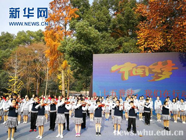 活动现场,由武汉大学附小、附中和大学生们创作表演的情景剧《法律护我前行》、快板《说唱宪法》,生动表现了宪法跟每个人息息相关,宪法在生活工作中无时不在、无刻不在,激发师生学习宪法热情;歌曲大合唱《宪法伴我成长》,表达了乘着宪法的翅膀,追逐法治梦想,坚定信仰,奋进向上的美好理想。