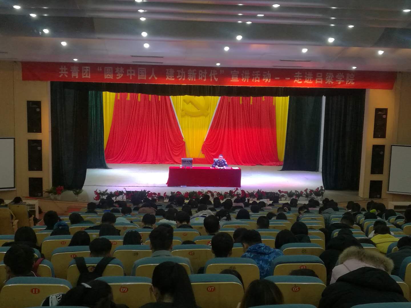 为深入学习宣传贯彻党的十九大精神,充分发挥团员青年的生力军和突击队作用,11月30日下午,党的十九大代表、团市委兼职副书记、柳林县网安大队大队长袁子捷为我校团员青年作了题为“圆梦中国人 建功新时代”的党的十九大精神主题宣讲。我校党委副书记刘自强、共青团吕梁市委书记郭清智与我校各级团干、辅导员、学生代表共计430余人一起聆听了宣讲。